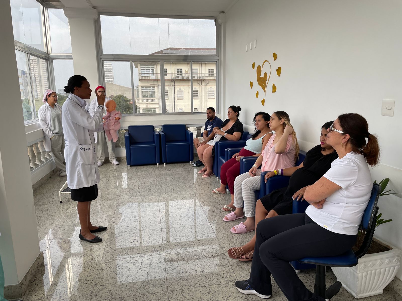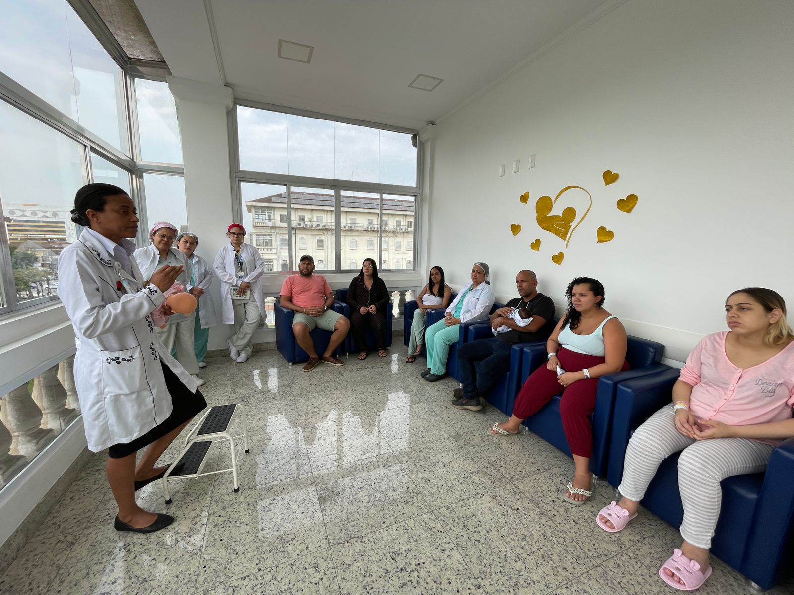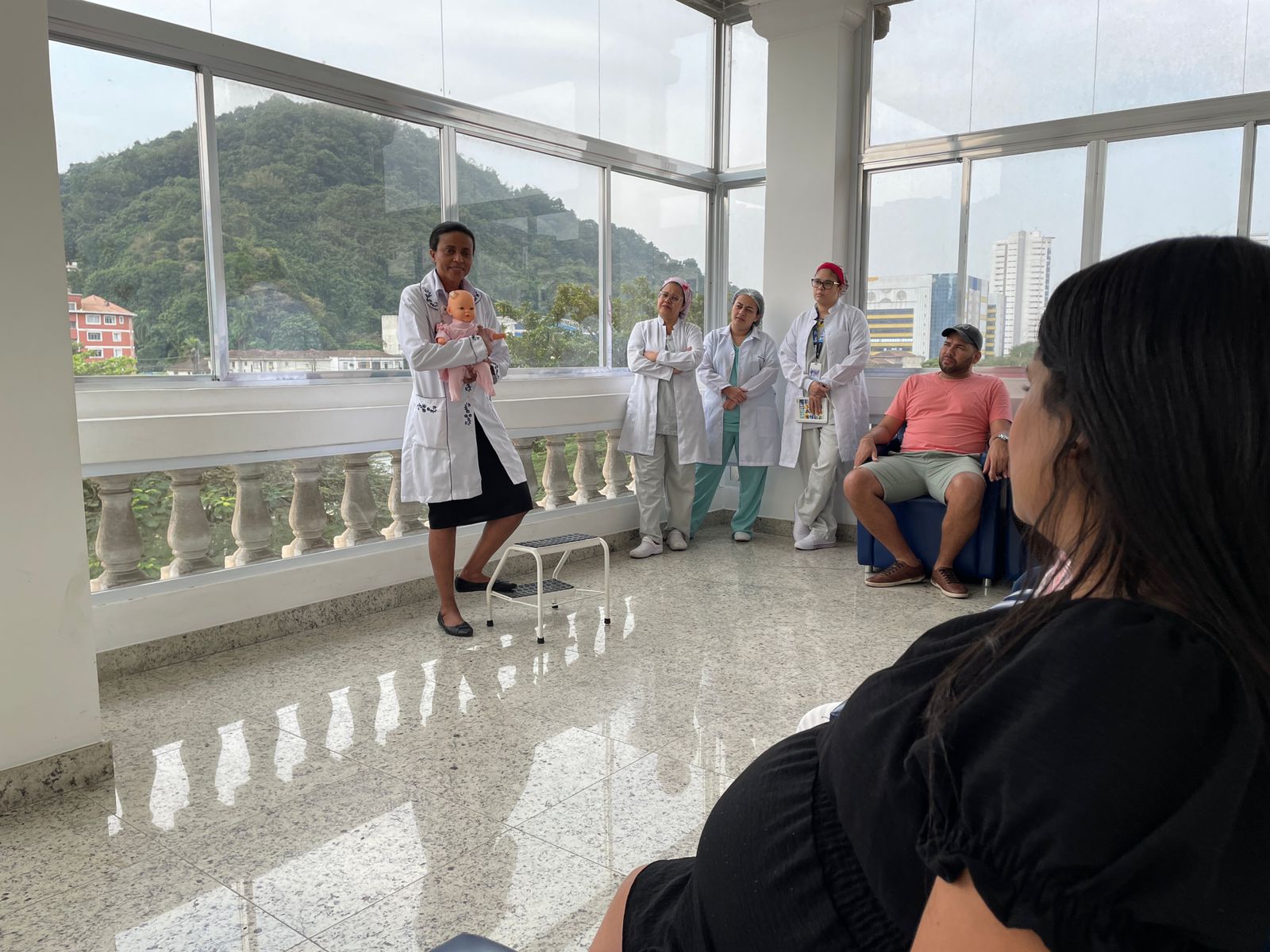 No terceiro dia de ação, foi a vez da enfermeira Adriana Silva, do setor de Educação Continuada da Santa Casa de Santos, falar sobre as manobras de desengasgo do recém-nascido. Um tema também muito importante e é um procedimento rápido de primeiros socorros para tratar asfixia por obstrução das vias respiratórias superiores.