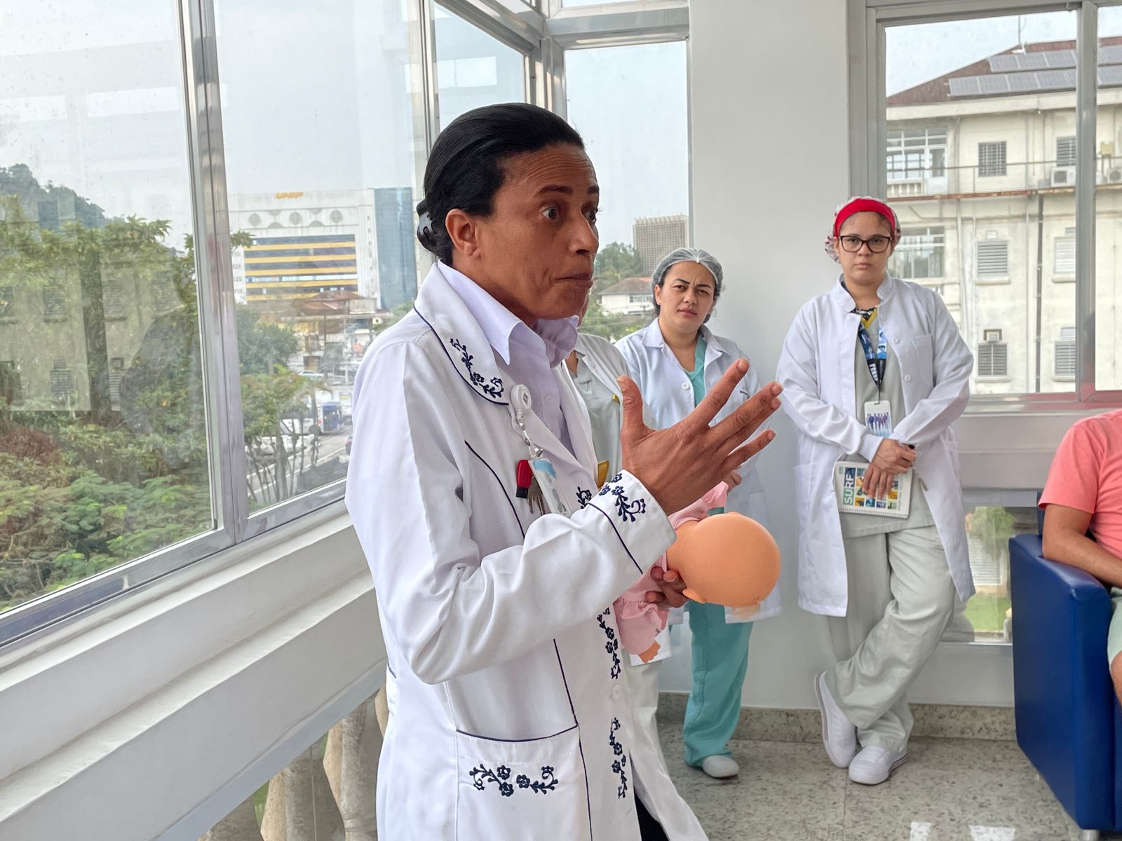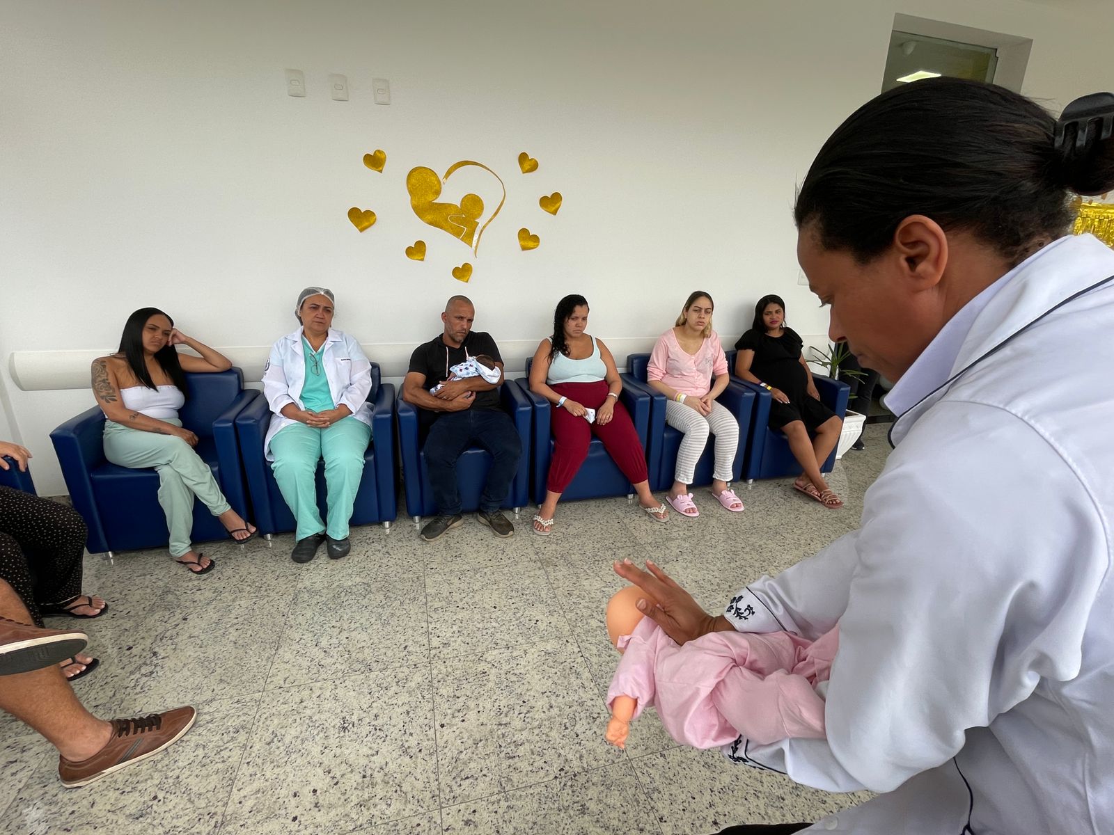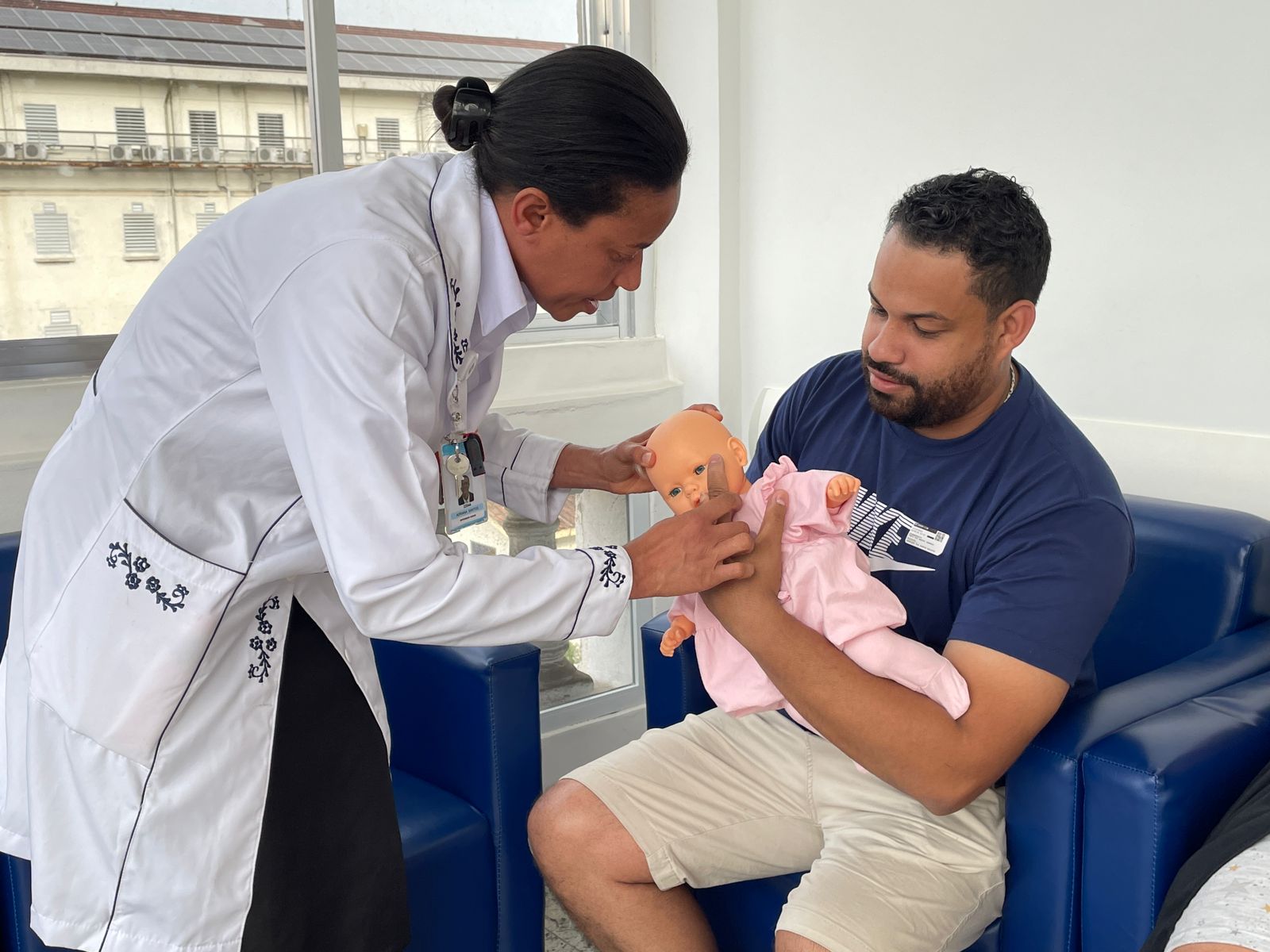 No terceiro dia de ação, foi a vez da enfermeira Adriana Silva, do setor de Educação Continuada da Santa Casa de Santos, falar sobre as manobras de desengasgo do recém-nascido. Um tema também muito importante e é um procedimento rápido de primeiros socorros para tratar asfixia por obstrução das vias respiratórias superiores.