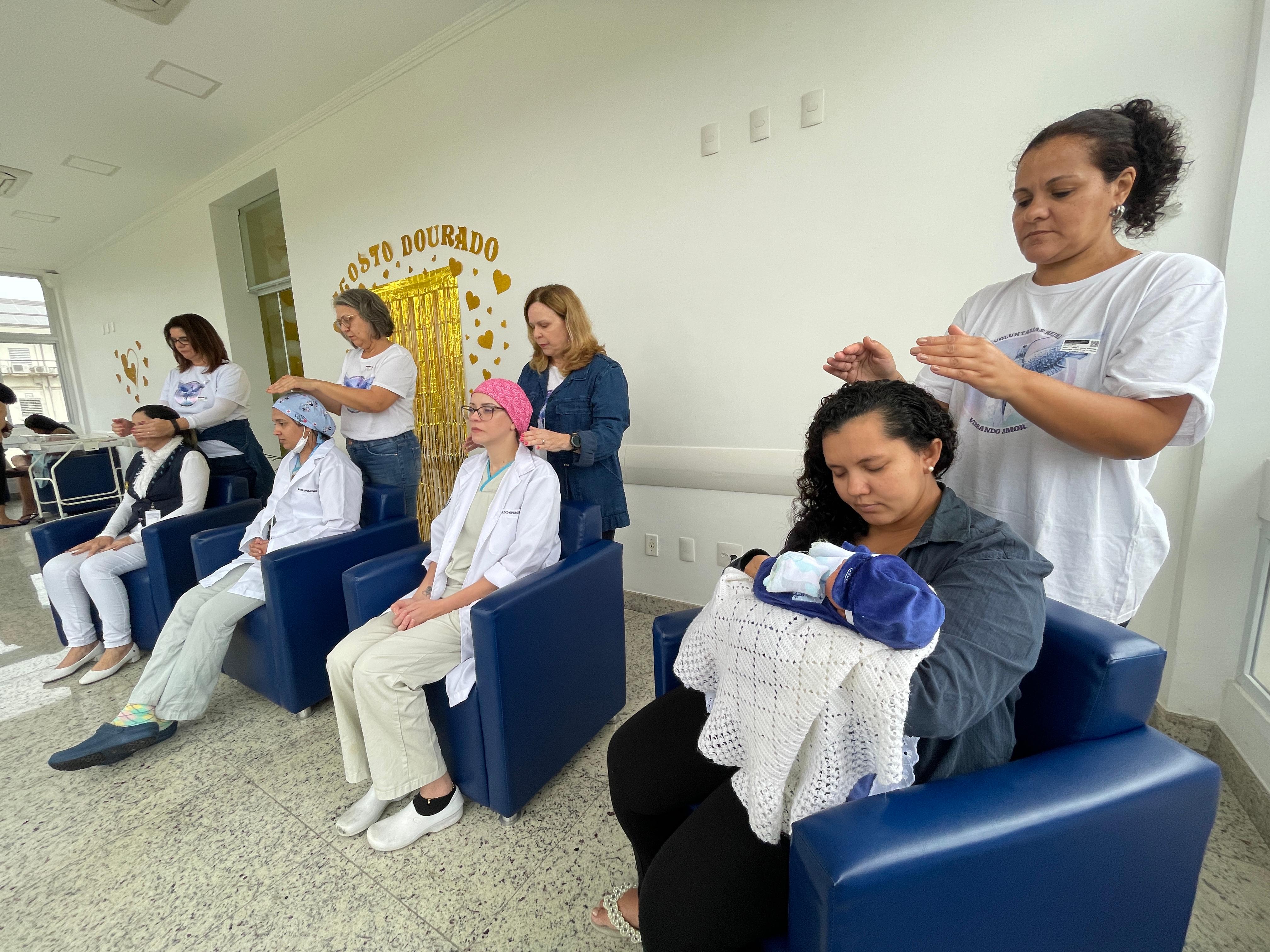 No último dia, as mamães puderam fazer sessões de Reiki, com o Grupo Vibrando Amor. O Reiki é uma terapia integrativa complementar que usa a imposição das mãos para transferir “energia vital universal” para fins curativos. Esta prática é baseada em conhecimentos orientais tradicionais, e trabalha o ser humano de forma holística (atuando nos níveis emocional, mental e físico), restabelecendo o equilíbrio energético vital. É importante destacar que o Reiki não é uma prática religiosa, não é invasivo e não tem contraindicações ou efeitos adversos.