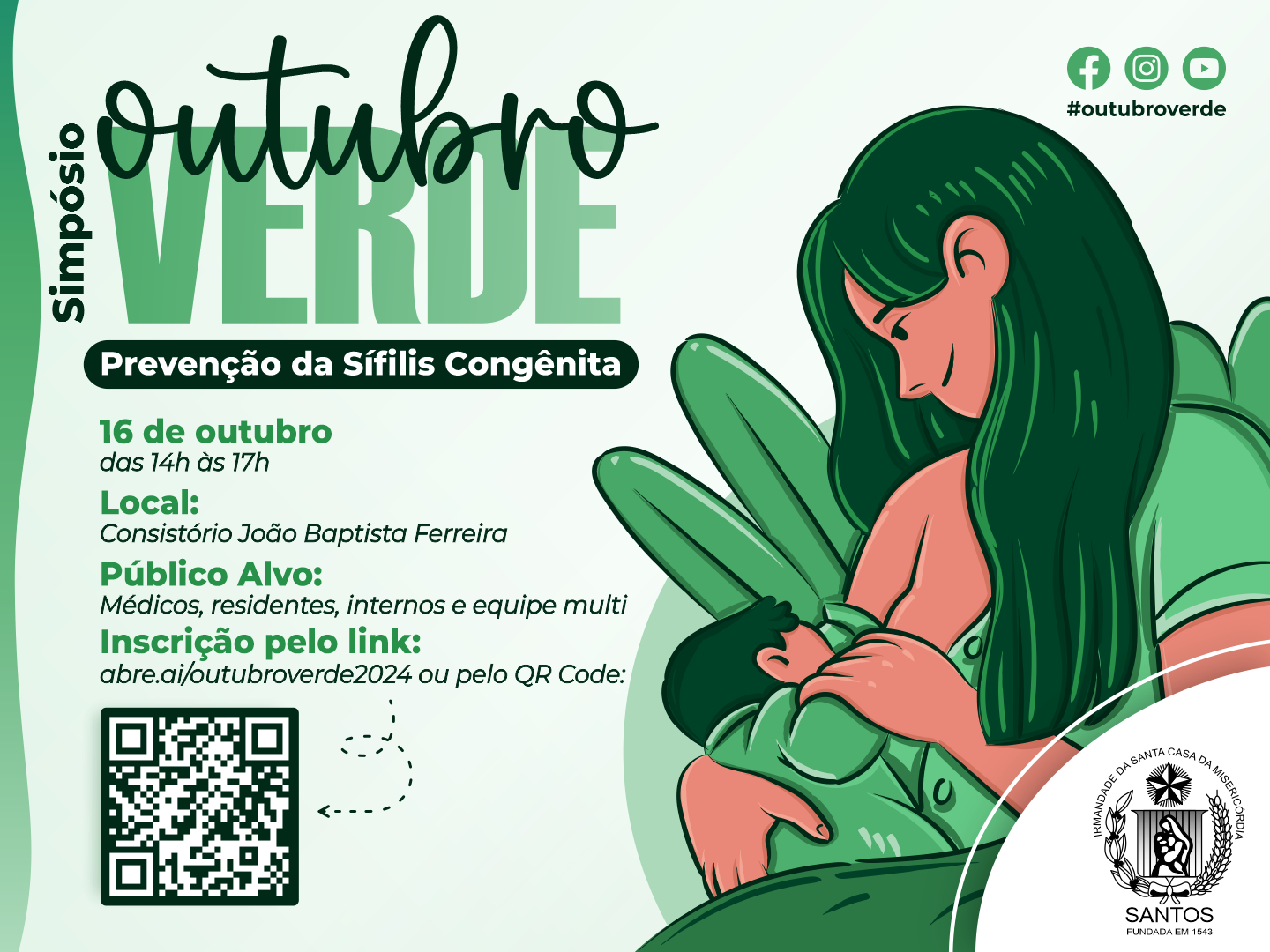 No dia 16/10, às 14 horas, o Serviço de Pediatria da Santa Casa de Santos promoverá o Simpósio Outubro Verde - Prevenção da Sífilis Congênita. O evento será no consistório da instituição e é aberto para médicos, residentes, internos e equipes multiprofissionais da Santa Casa de Santos.