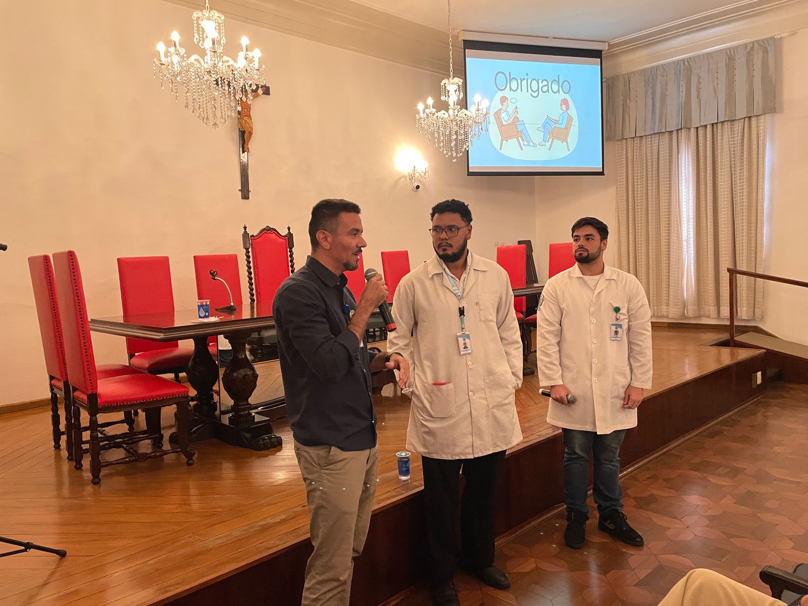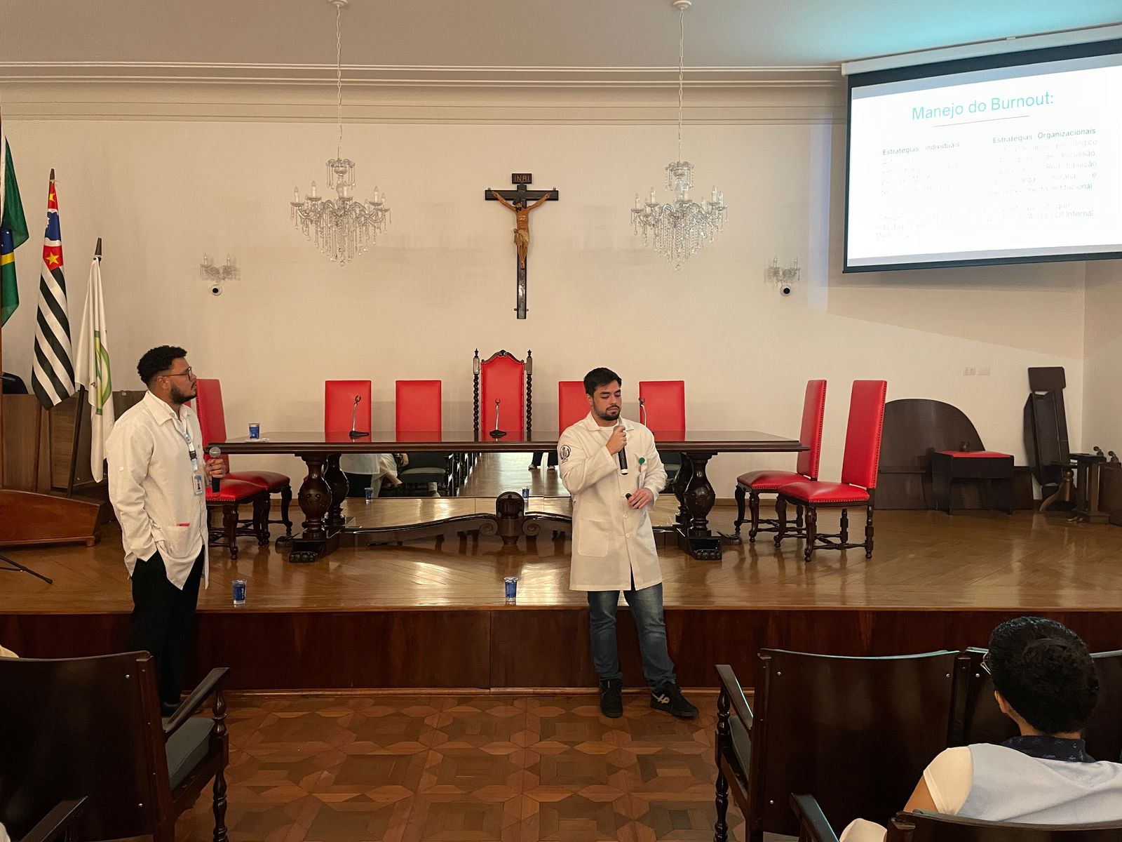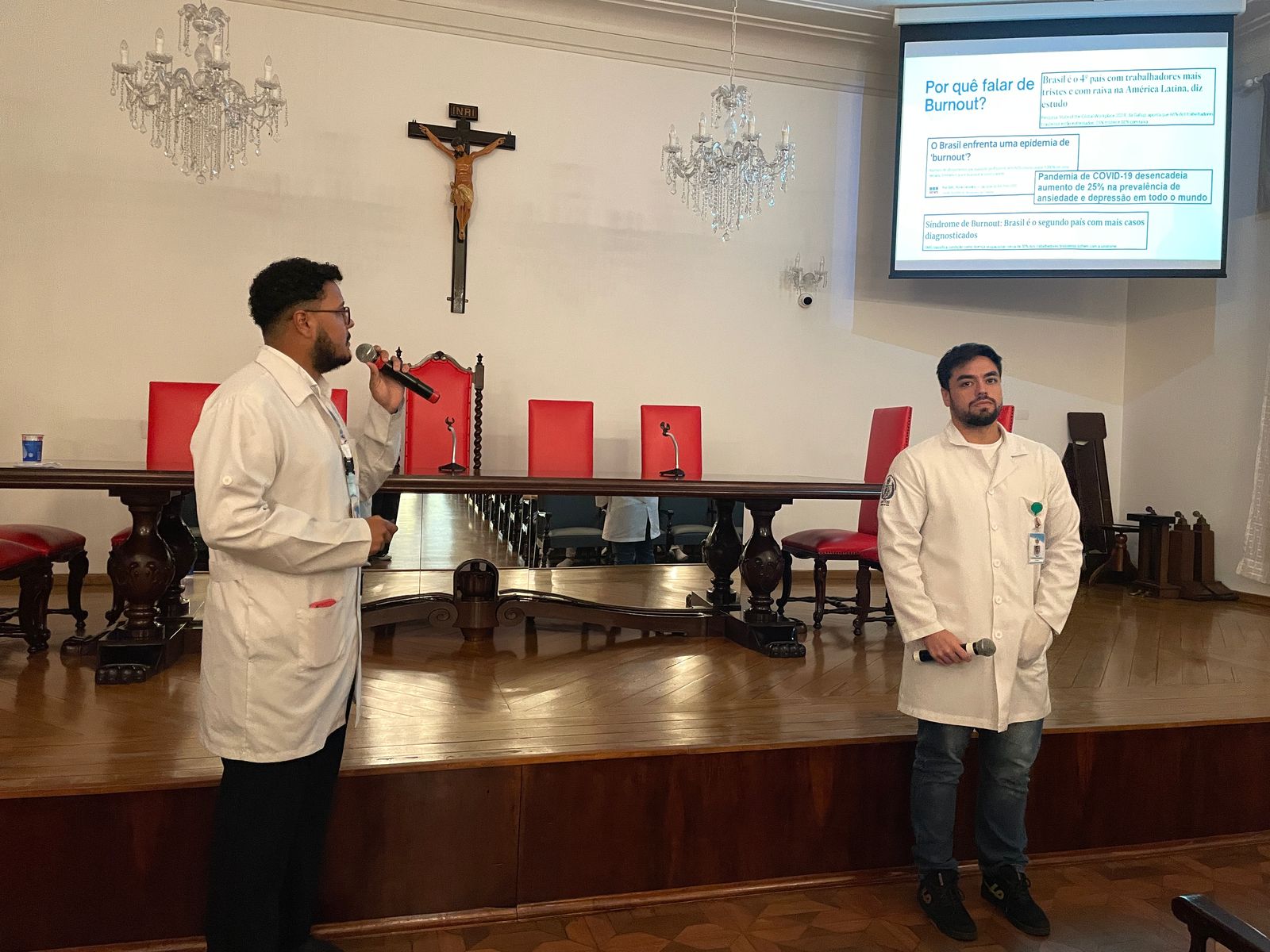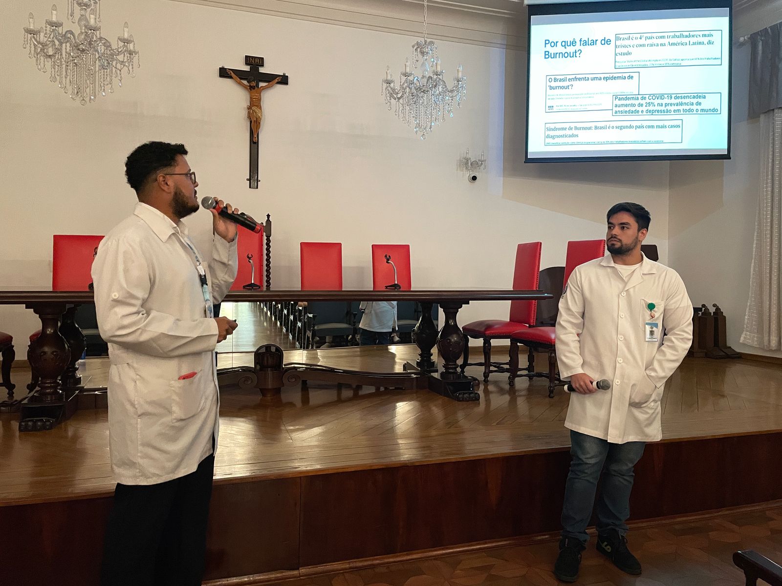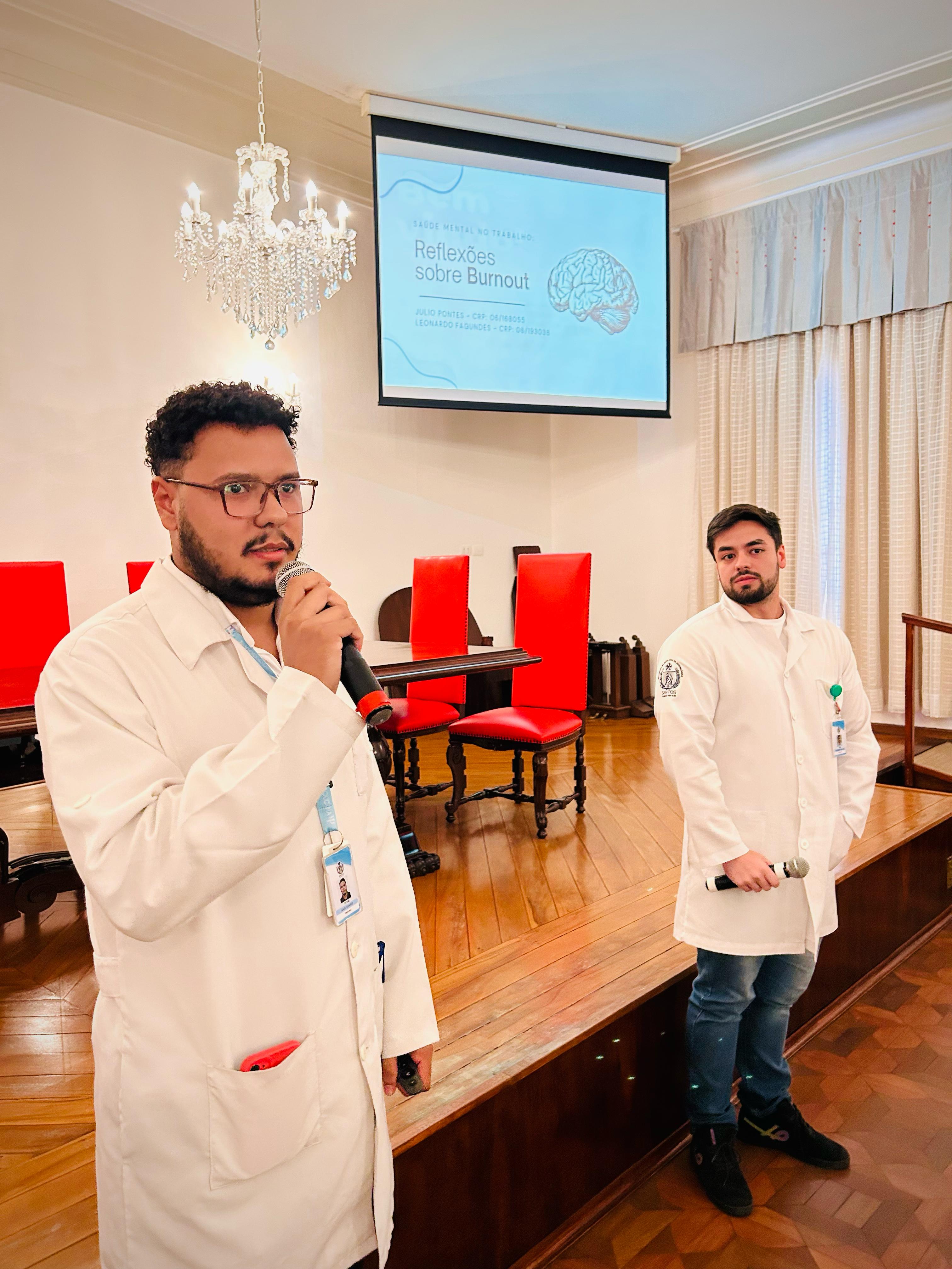 Na palestra da tarde do dia 25/3, os Psicólogos Ocupacionais da Santa Casa, Júlio Maurício e Leonardo Fagundes, falaram sobre o Burnout e a exaustão profissional.